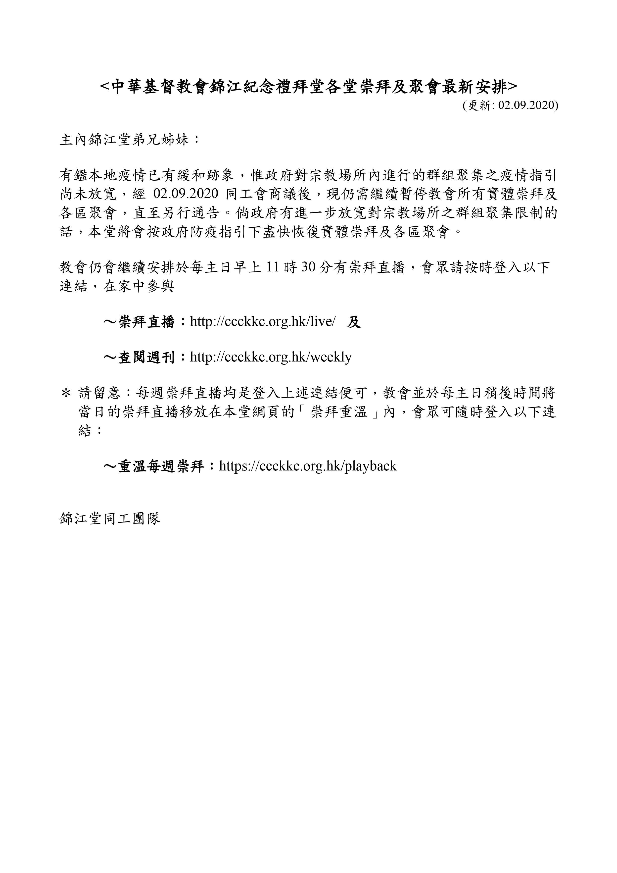 有鑑本地疫情已有緩和跡象,惟政府對宗教場所內進行的群組聚集之疫情指引尚未放寬,經02.09.2020同工會商議後,現仍需繼續暫停教會所有實體崇拜及各區聚會,直至另行通告。倘政府有進一步放寬對宗教場所之群組聚集限制的話,本堂將會按政府防疫指引下盡快恢復實體崇拜及各區聚會。