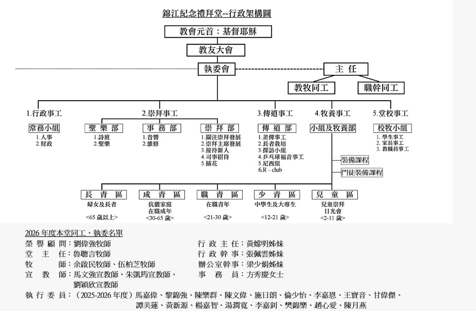 全教會分六區(兒童區、少青區、職青區、成青區、長者區),各區均勻發展,故此她對不同年齡、背境的新來賓有較大的包容度,會眾多元化是她一項有利發展的潛質,也是高難度牧養關顧的因素。